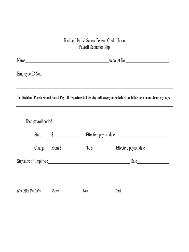 Richland Parish School Federal Credit Union Payroll Deduction Slip Name Account No. Employee ID No. To: Richland Parish School Board Payroll Department: I hereby authorize you to deduct the following