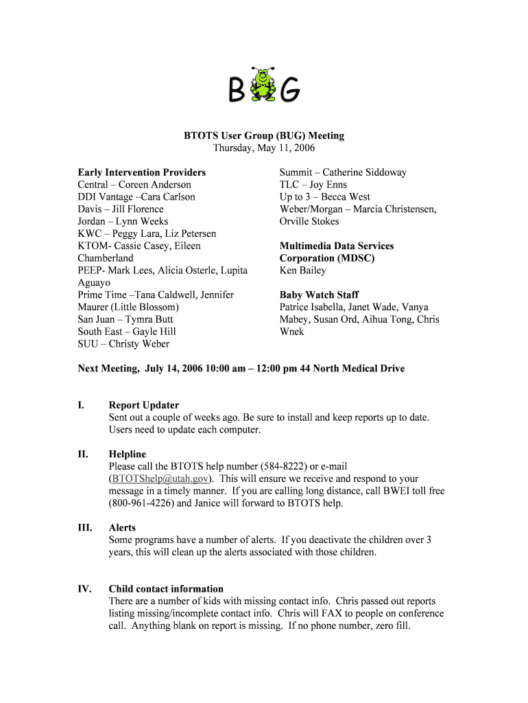 BOOTS User Group (BUG) Meeting Thursday, May 11, 2006, Early Intervention Providers Central Doreen Anderson DDI Vantage Cara Carlson Davis Jill Florence Jordan Lynn Weeks KWC Peggy Lara, Liz Petersen