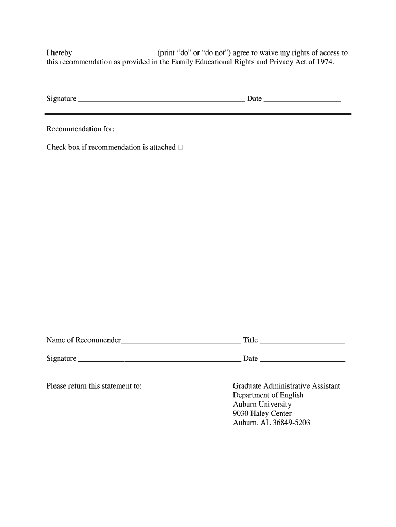 I hereby (print do or do not) agree to waive my rights of access to this recommendation as provided in the Family Educational Rights and Privacy Act of 1974. Signature Date Recommendation for: Check