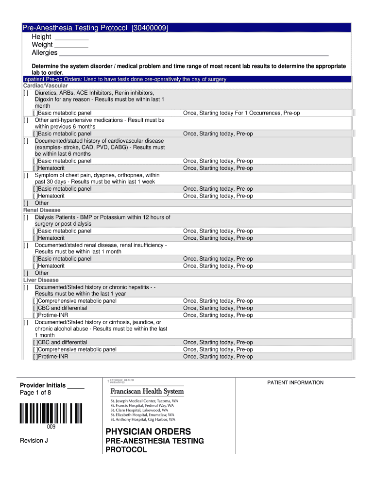Anesthesia Testing Protocol 30400009 Height Weight Allergies Determine the system disorder / medical problem and time range of most recent lab results to determine the appropriate lab to order. Inpatient