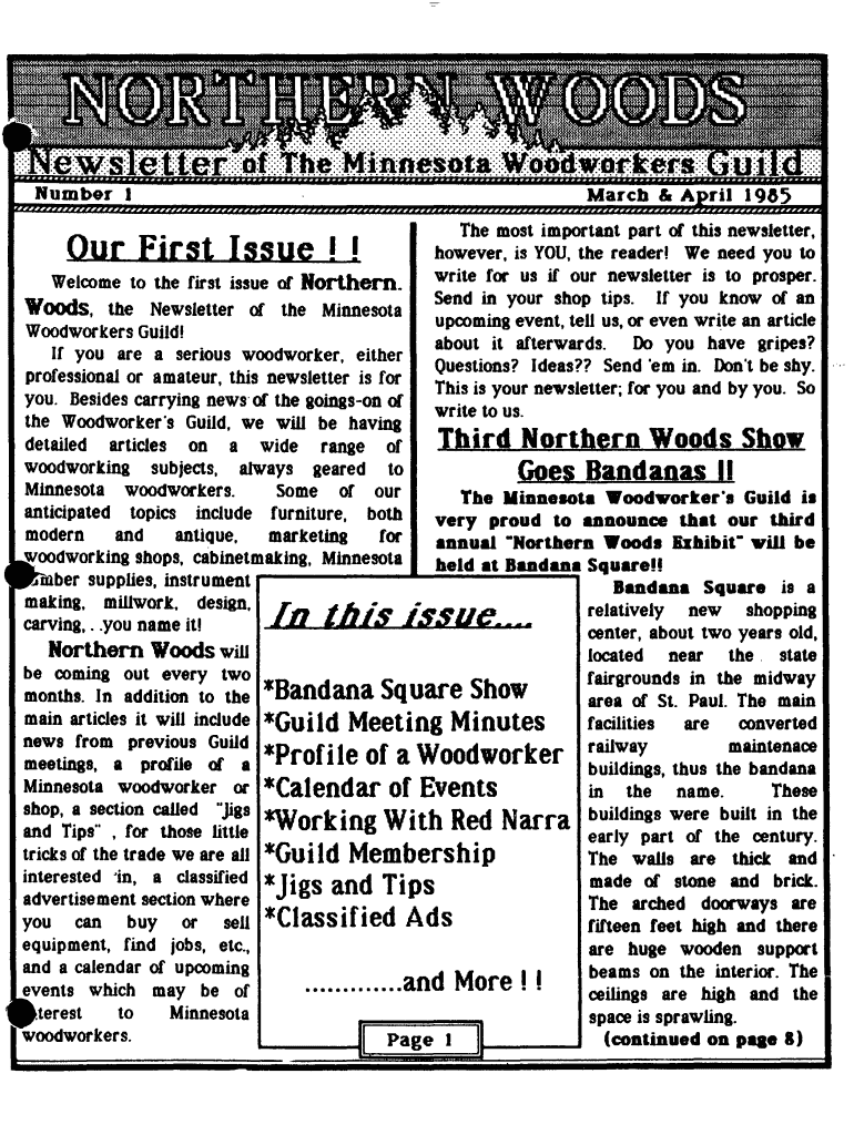 Our First Issue ! ! Welcome to the first issue or Northern. Woods, tb.e Newsletter of the Minnesota The most important part of this newsletter, however, is YOU, the readers We need you to write for
