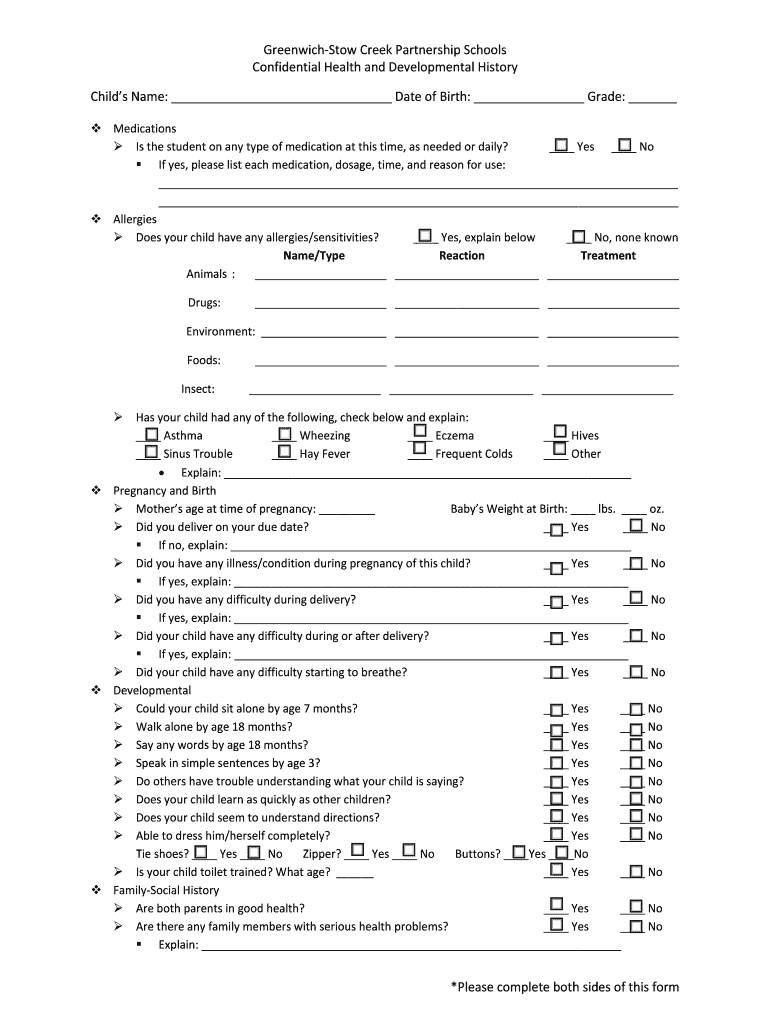 GreenwichStow Creek Partnership Schools Confidential Health and Developmental History Child's Name: Date of Birth: Grade: Medications Is the student on any type of medication at this time, as needed