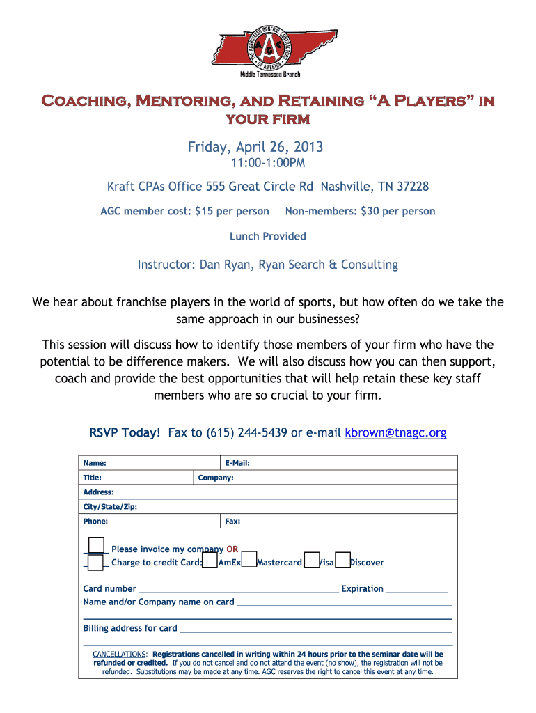 Coaching, Mentoring, and Retaining A player in your firm Friday, April 26, 2013 11:001:00PM Kraft CPA's Office 555 Great Circle Rd Nashville, TN 37228 AGC member cost: $15 per person Nonmembers: $30
