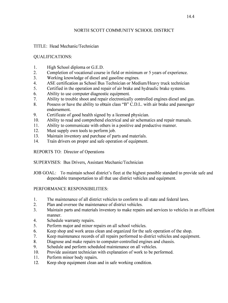 14.4 NORTH SCOTT COMMUNITY SCHOOL DISTRICT TITLE: Head Mechanic/Technician QUALIFICATIONS: 1. 2. 3. 4. 5. 6. 7. 8. 9. 10. 11. 12. 13. 14. High School diploma or G.E.D. Completion of vocational course
