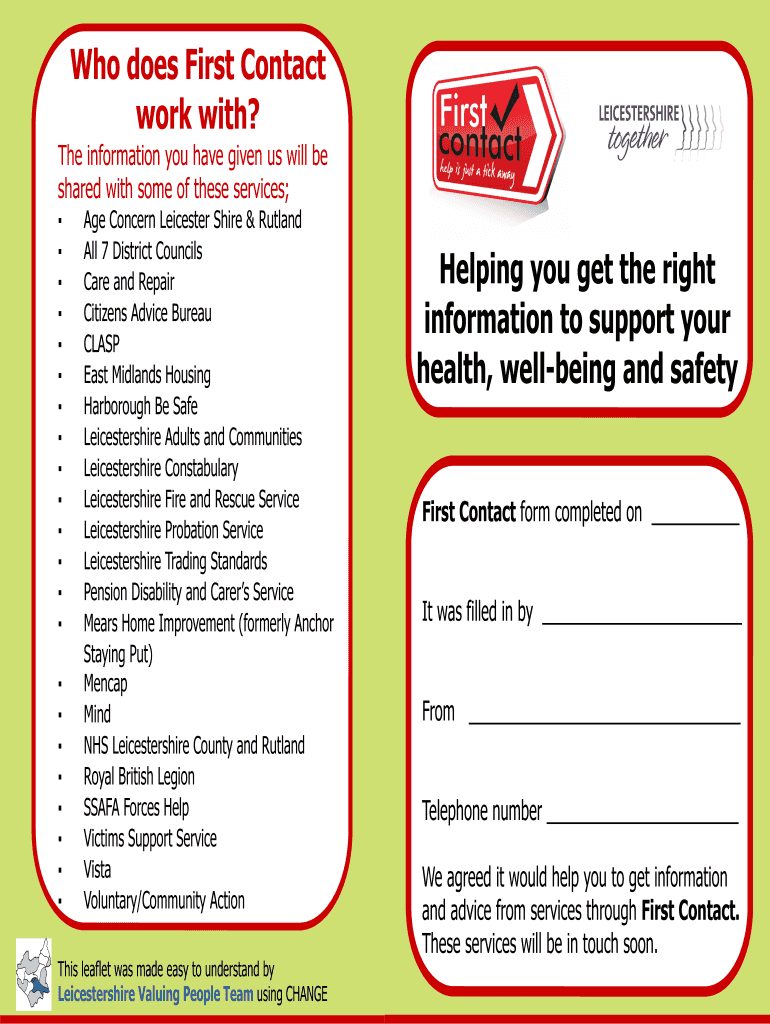 Who does First Contact work with? The information you have given us will be shared with some of these services; Age Concern Leicester Shire & Jutland All 7 District Councils Care and Repair Citizens