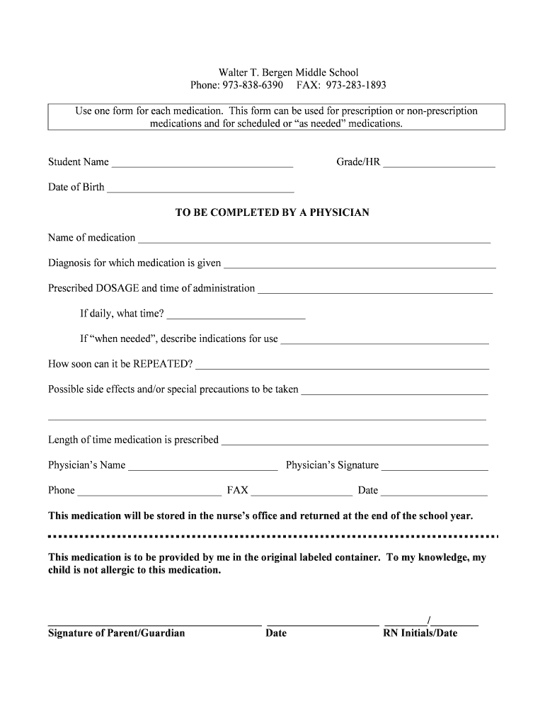 Walter T. Bergen Middle School Phone: 9738386390 FAX: 9732831893 Use one form for each medication. This form can be used for prescription or nonprescription medications and for scheduled or as needed