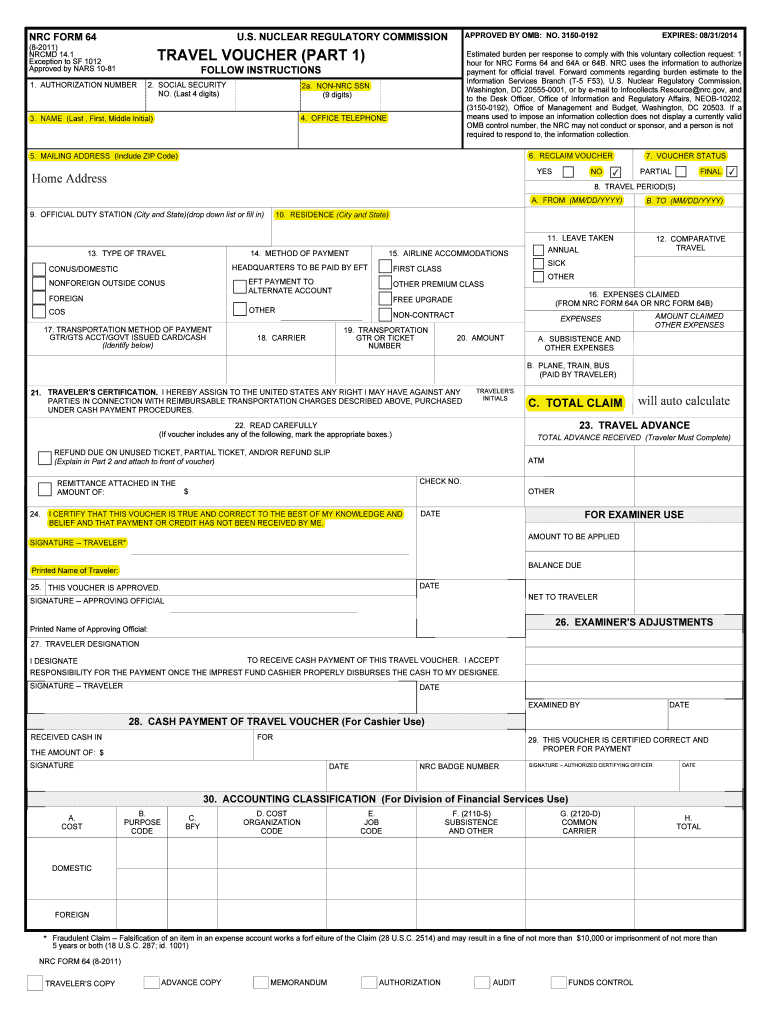 APPROVED BY OMB: NO. 31500192 U.S. NUCLEAR REGULATORY COMMISSION NRC FORM 64 (82011) NR CMD 14.1 Exception to SF 1012 Approved by CARS 1081 TRAVEL VOUCHER (PART 1) FOLLOW INSTRUCTIONS 1. AUTHORIZATION