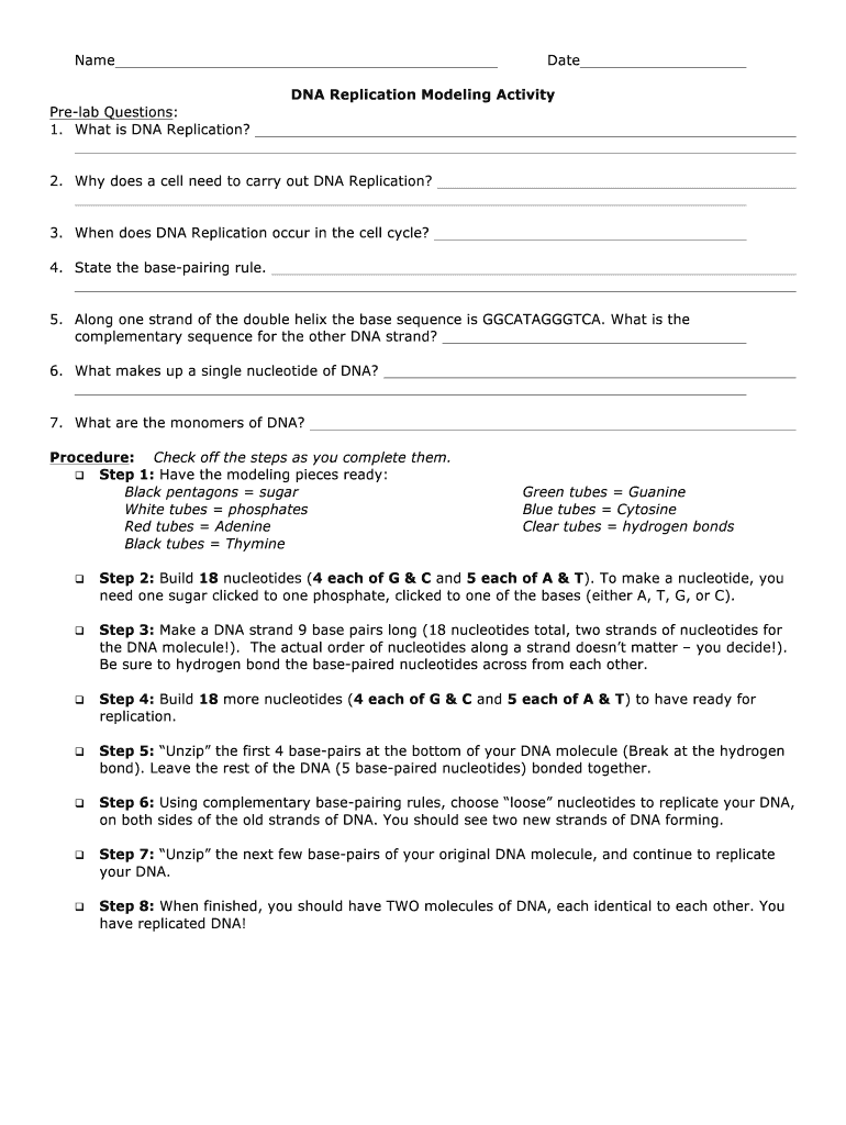 Name Date DNA Replication Modeling Activity Prelab Questions: 1. What is DNA Replication? 2. Why does a cell need to carry out DNA Replication? 3. When does DNA Replication occur in the cell cycle?