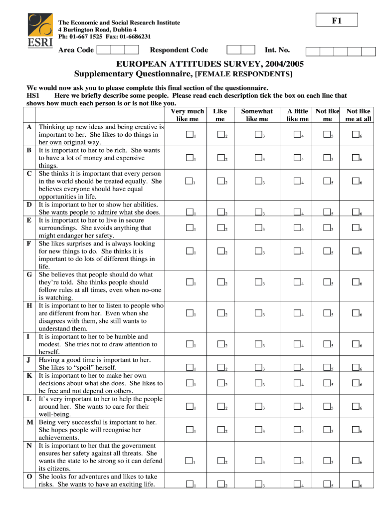 F1 The Economic and Social Research Institute 4 Burlington Road, Dublin 4 pH: 01667 1525 Fax: 016686231 Area Code Respondent Code In Int. No. EUROPEAN ATTITUDES SURVEY, 2004/2005 Supplementary Questionnaire,
