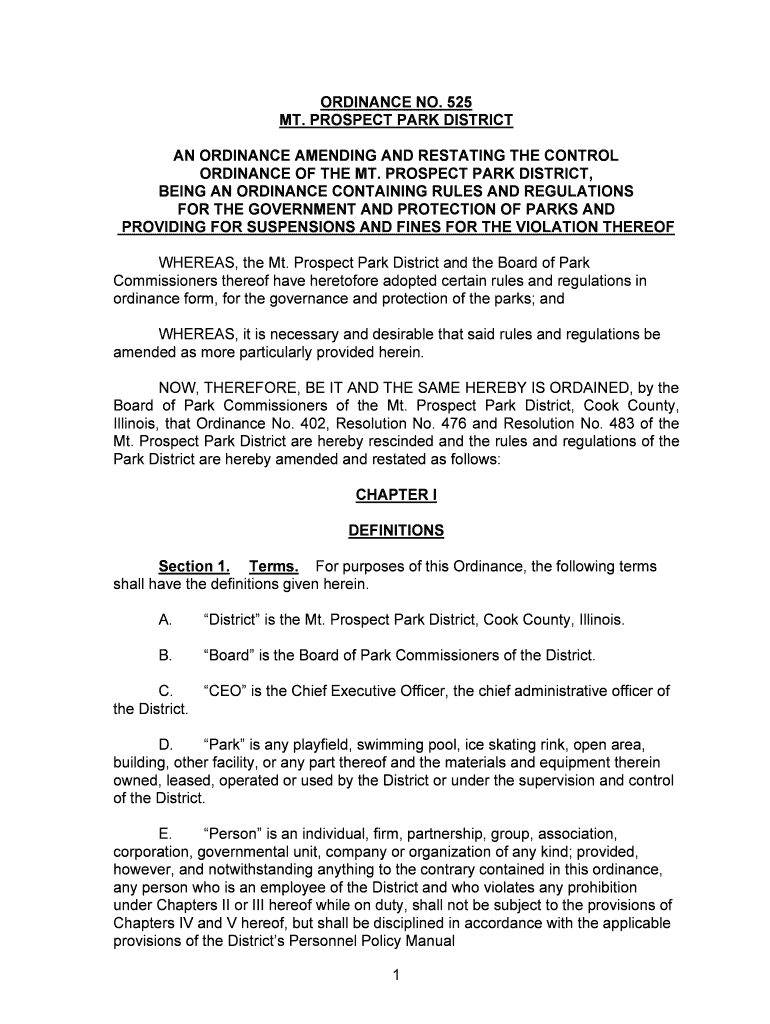 ORDINANCE OF THE MT. PROSPECT PARK DISTRICT,