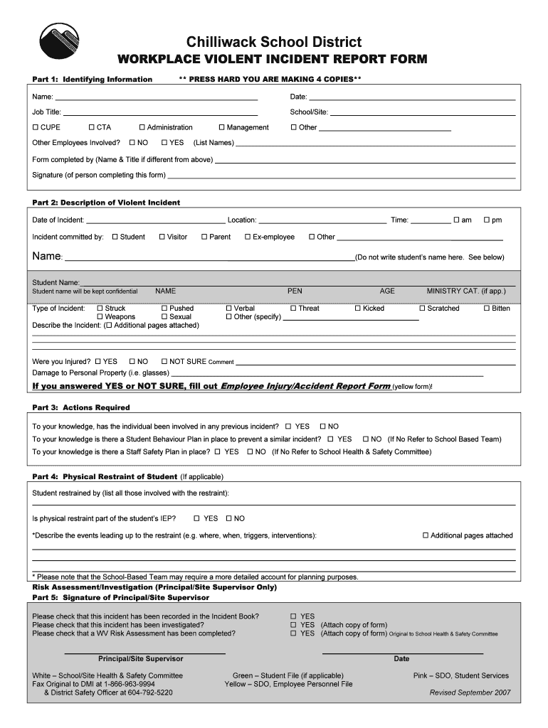 Chilliwack School District WORKPLACE VIOLENT INCIDENT REPORT FORM Part 1: Identifying Information ** PRESS HARD YOU ARE MAKING 4 COPIES** Name: Date: Job Title: School/Site: CUP CTA Administration