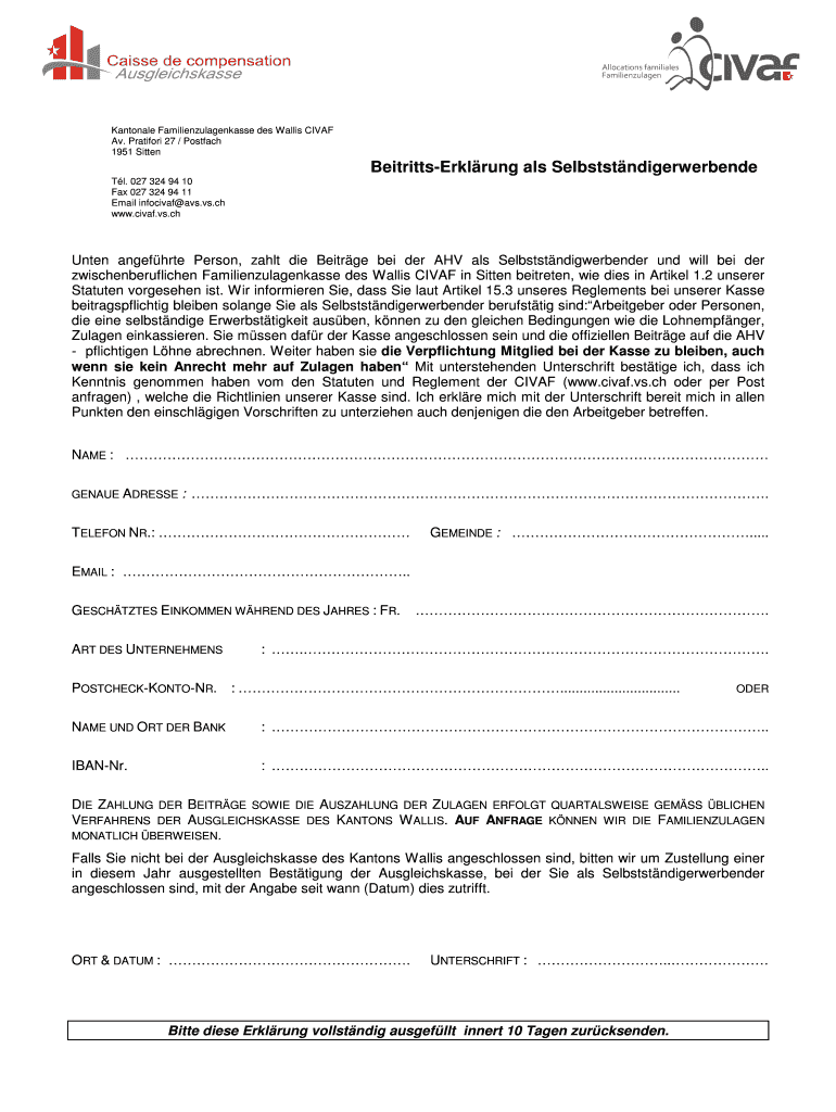 Cantonal Familienzulagenkasse DES Wallis CIV AF Av. Platform 27 / Postal 1951 Kitten BeitrittsErklrung ALS Selbststndigerwerbende Tl. 027 324 94 10 Fax 027 324 94 11 Email infocivaf AVS.vs.ch www.civaf.vs.ch