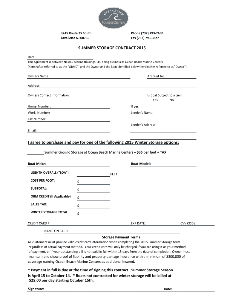 3245 Route 35 South LaFollette NJ 08735 Phone (732) 7937460 Fax (732) 7936827 SUMMER STORAGE CONTRACT 2015 Date: This Agreement is between Nassau Marina Holdings, LLC doing business as Ocean Beach