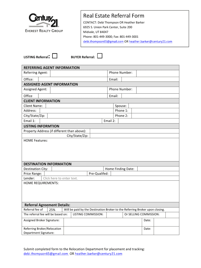 Real Estate Referral Form LISTING Referral : CONTACT: Debt Thompson OR Heather Barker 6925 S. Union Park Center, Suite 200 Midvale, UT 84047 Phone: 8014493000; Fax: 8014493001 debt.thompson65 gmail.com