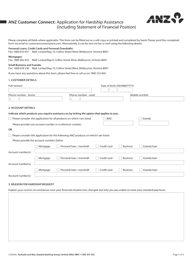 ANZ Customer Connect: Application for Hardship Assistance (including Statement of Financial Position) Please complete all fields where applicable. This form can be filled out as a soft copy or printed