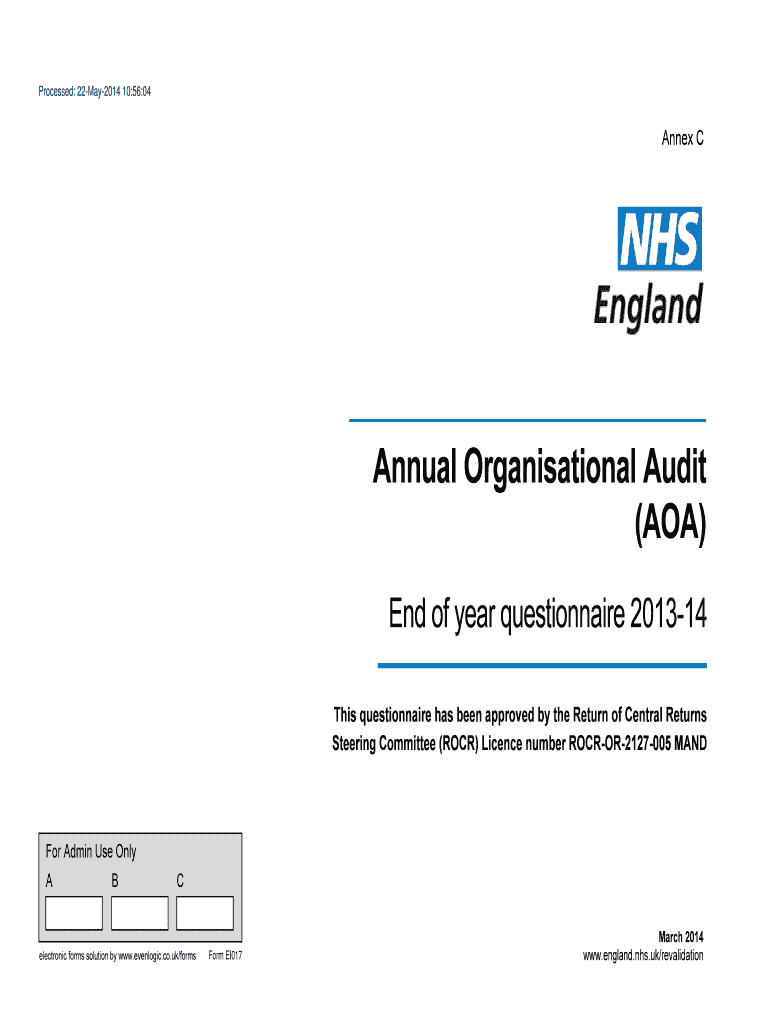 Processed: 22May2014 10:56:04 Annex C Annual Organizational Audit (AOA) End of year questionnaire 201314 This questionnaire has been approved by the Return of Central Returns Steering Committee (ROCK)
