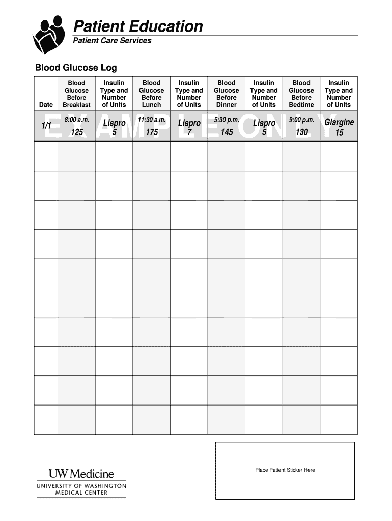 Patient Education Patient Care Services Blood Glucose Log Date Blood Glucose Before Breakfast Insulin Type and Number of Units Blood Glucose Before Lunch Insulin Type and Number of Units Blood Glucose