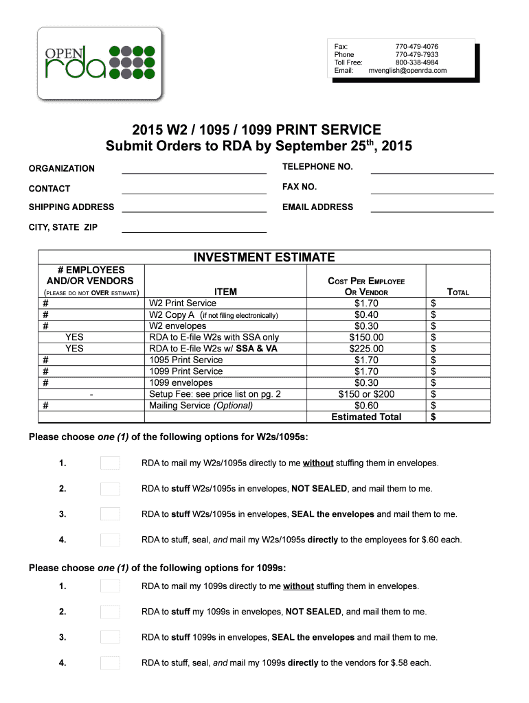 Fax: 7704794076 Phone 7704797933 Toll Free: 8003384984 Email: English openrda.com 2015 W2 / 1095 / 1099 PRINT SERVICE Submit Orders to RDA by September 25th, 2015 ORGANIZATION TELEPHONE NO. CONTACT