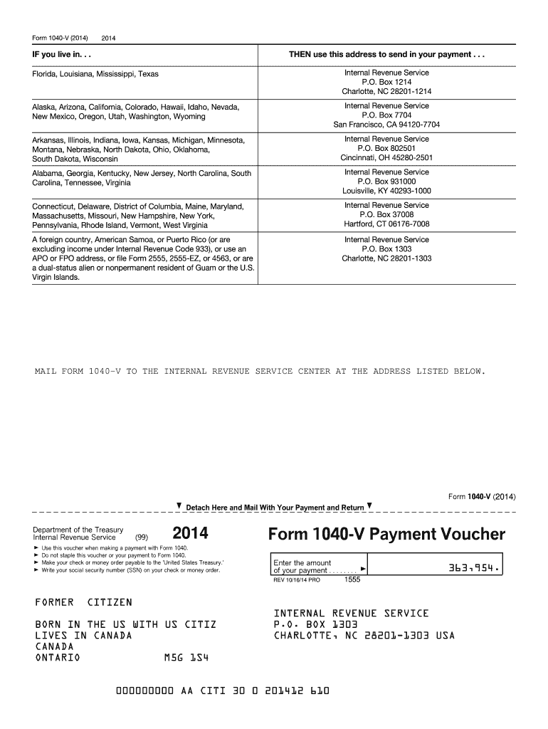 Form 1040V (2014) 2014 IF you live in. . . THEN use this address to send in your payment. . . Internal Revenue Service P.O. Box 1214 Charlotte, NC 282011214 Florida, Louisiana, Mississippi, Texas