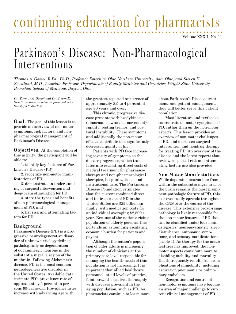 Continuing education for pharmacists Volume XXXII, No. 11 Parkinson's Disease: Pharmacological Interventions Thomas A. Gospel, R. pH., Ph.D., Professor Emeritus, Ohio Northern University, Ada, Ohio;