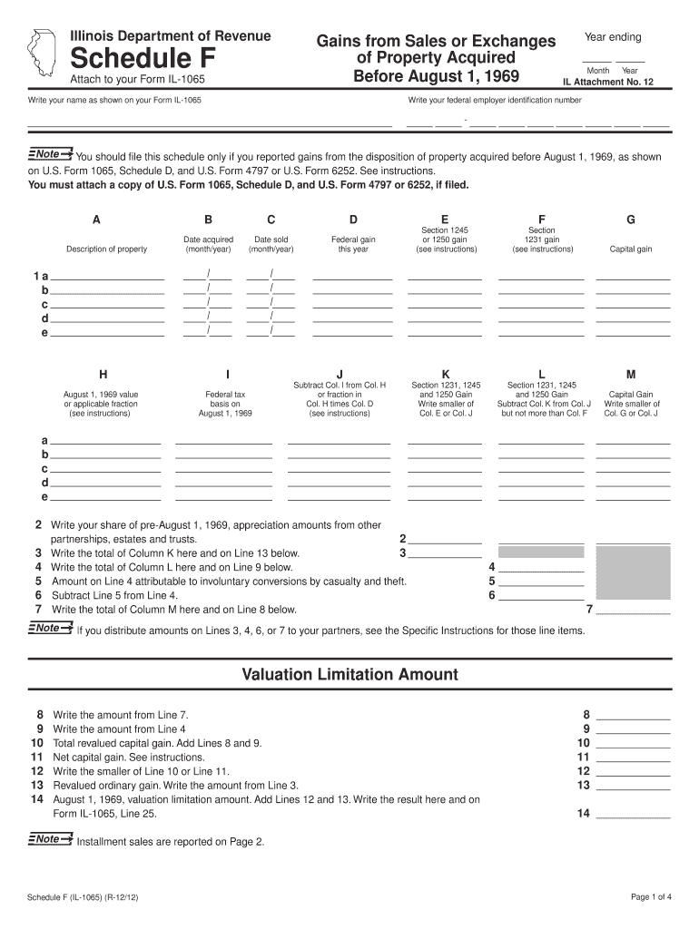 Use your mouse or Tab key to move through the fields. Use your mouse or space bar to enable check boxes. Illinois Department of Revenue Schedule F Attach to your Form IL1065 Gains from Sales or Exchanges