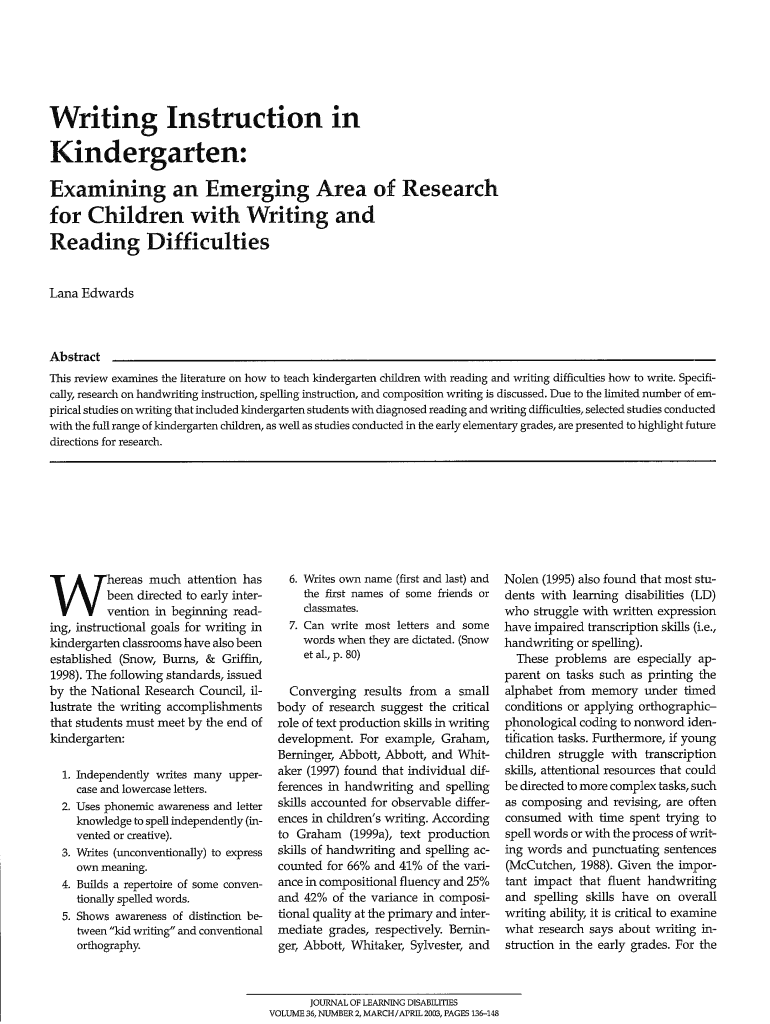 Writing Instruction in Kindergarten: Examining an Emerging Area of Research for Children with Writing and Reading Difficulties Lana Edwards Abstract This review examines the literature on how to teach