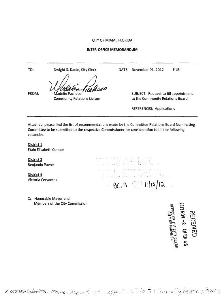 This memorandum serves to submit recommendations for appointments to the Community Relations Board for the City of Miami, detailing the candidates and their qualifications for board positions.