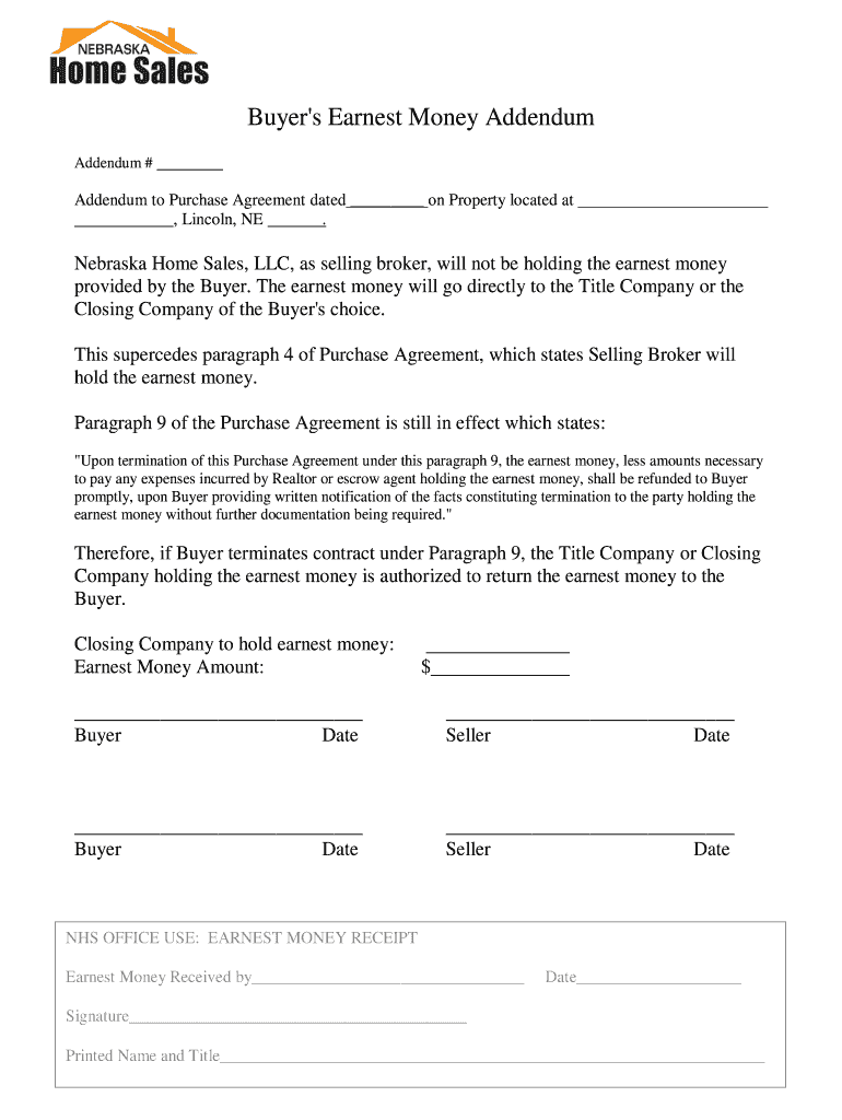 Buyer's Earnest Money Addendum # Addendum to Purchase Agreement dated on Property located at, Lincoln, NE. Nebraska Home Sales, LLC, as selling broker, will not be holding the earnest money provided