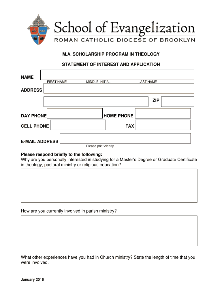 M.A. SCHOLARSHIP PROGRAM IN THEOLOGY STATEMENT OF INTEREST AND APPLICATION NAME FIRST NAME MIDDLE INITIAL LAST NAME ADDRESS ZIP DAY PHONE HOME PHONE CELL PHONE FAX EMAIL ADDRESS Please print clearly