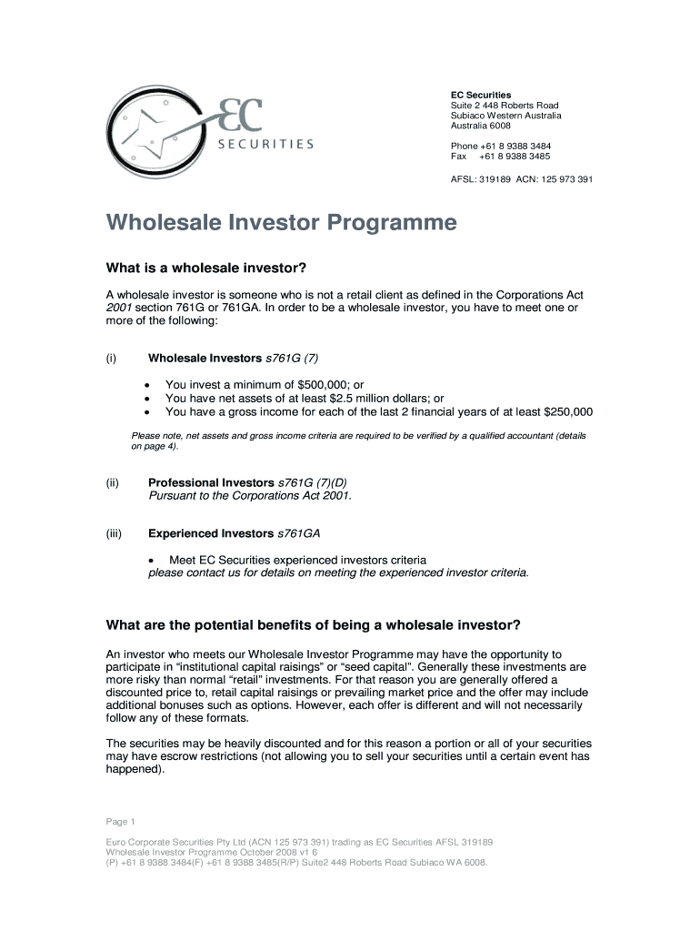 EC Securities Suite 2 448 Roberts Road Subrace Western Australia 6008 Phone +61 8 9388 3484 Fax +61 8 9388 3485 ADSL: 319189 ACN: 125 973 391 Wholesale Investor Program What is a wholesale investor?