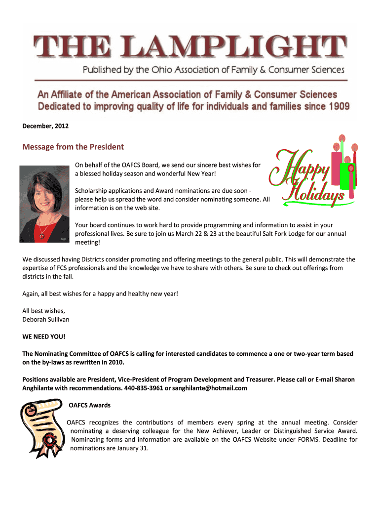 The December newsletter for the Ohio Association of Family and Consumer Sciences (OAFCS) is typically sent electronically to members and does not require any additional filling out.