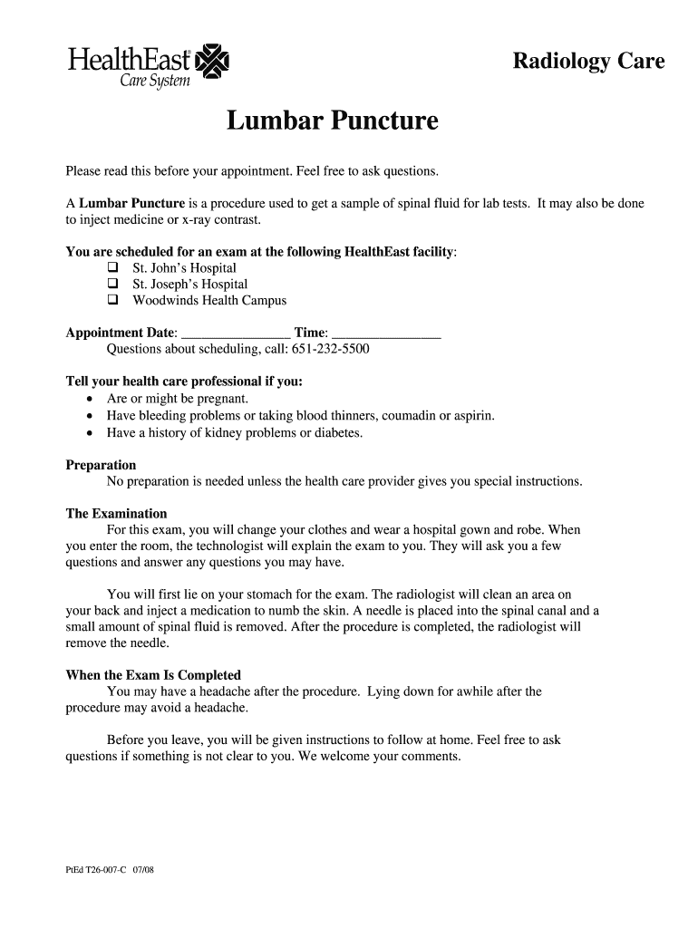 Get the free Lumbar Puncture - HealthEast