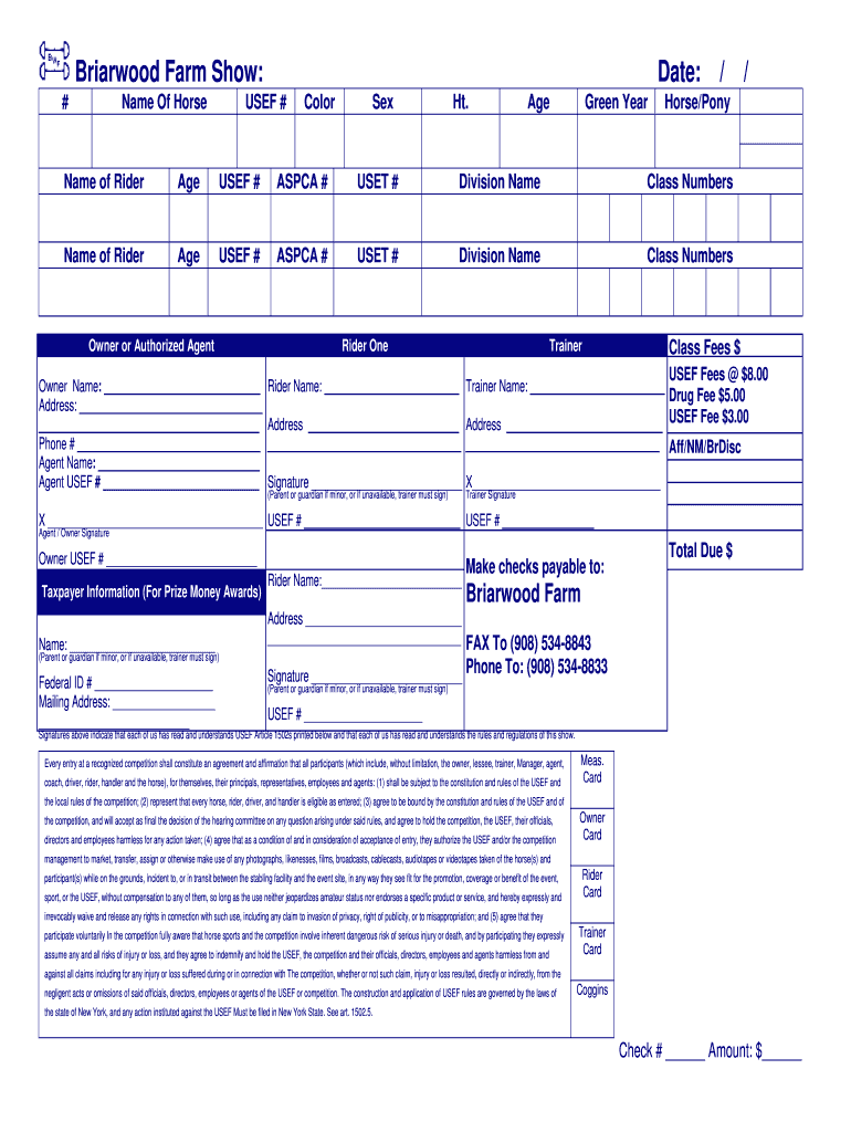 To fill out Briarwood farm show date, exhibitors need to provide information about their animals, contact details, and any other relevant details.