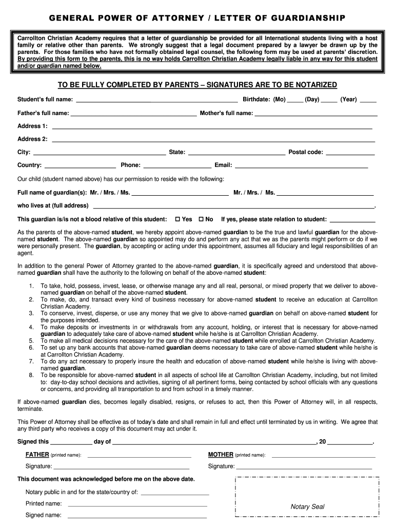 Get the free GENERAL POWER OF ATTORNEY LETTER OF GUARDIANSHIP - ccasaints