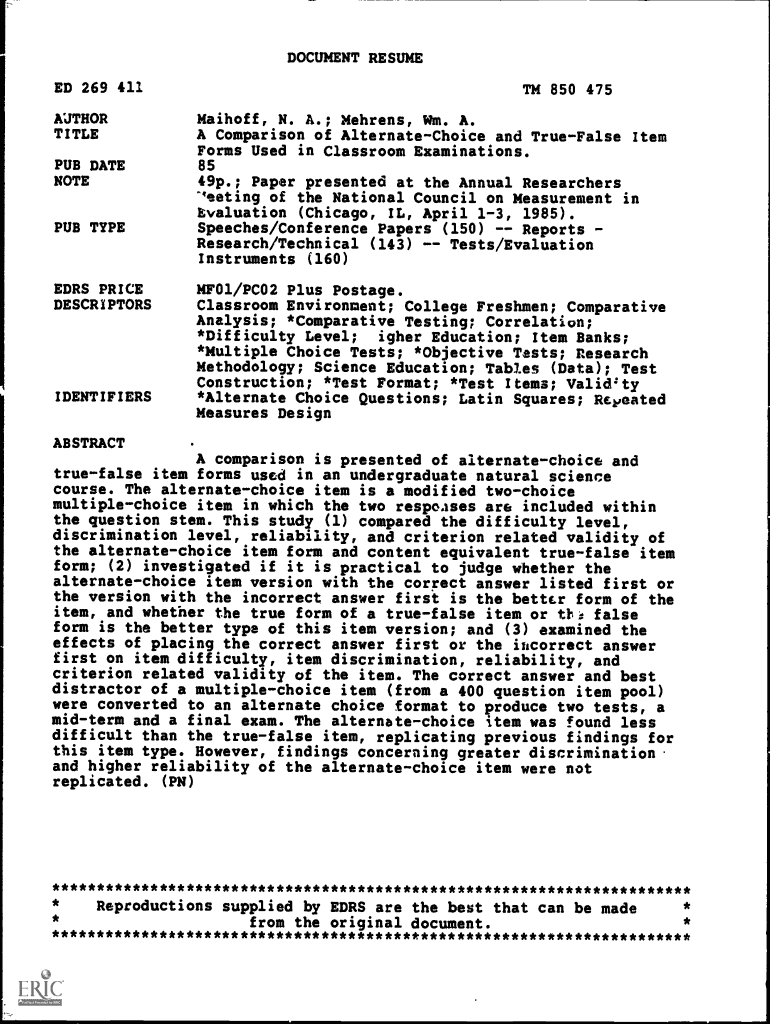 DOCUMENT RESUME ED 269 411 AUTHOR TITLE PUB DATE NOTE PUB TYPE EARS PRICE DESCRIPTORS IDENTIFIERS TM 850 475 Takeoff, N. A.; Meres, Wm. A. A Comparison of AlternateChoice and Truffles Item Forms Used