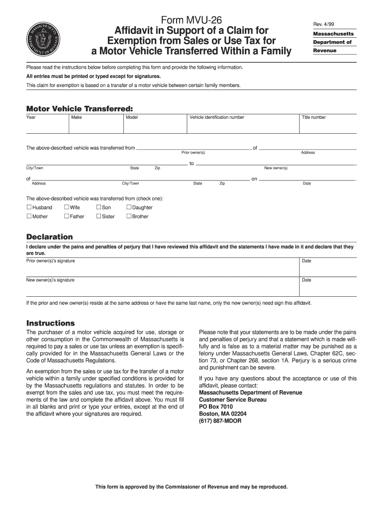 Form MVU26 Affidavit in Support of a Claim for Exemption from Sales or Use Tax for a Motor Vehicle Transferred Within a Family Rev. 4/99 Massachusetts Department of Revenue Please read the instructions