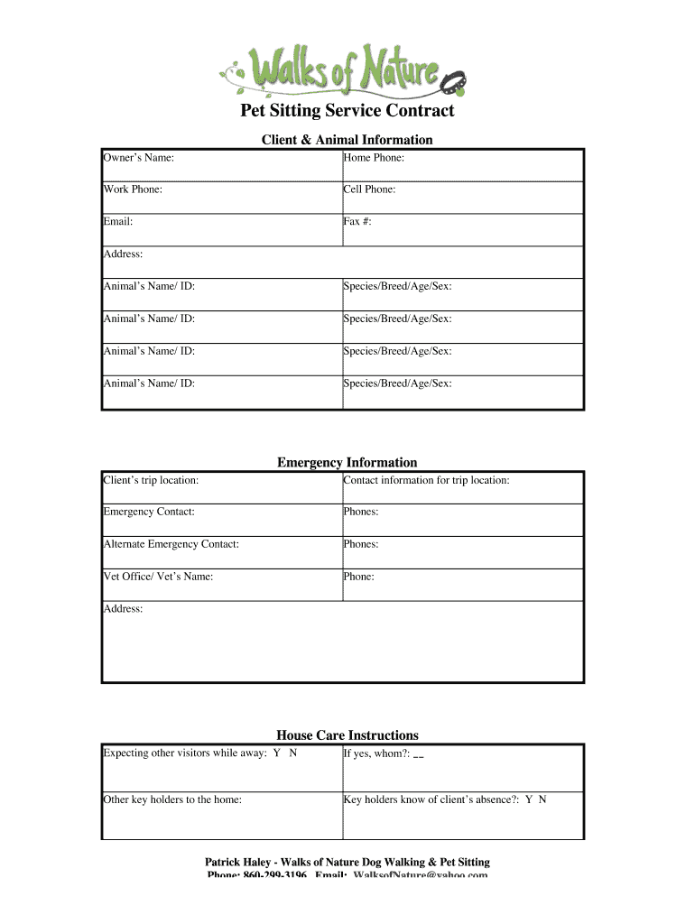 Pet Sitting Service Contract Client & Animal Information Owners Name: Home Phone: Work Phone: Cell Phone: Email: Fax #: Address: Animals Name/ ID: Species/Breed/Age/Sex: Animals Name/ ID: Species/Breed/Age/Sex:
