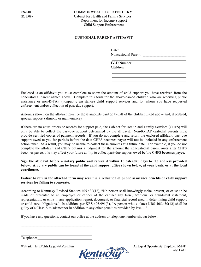CS148 (R. 3/09) COMMONWEALTH OF KENTUCKY Cabinet for Health and Family Services Department for Income Support Child Support Enforcement CUSTODIAL PARENT AFFIDAVIT Date: Noncustodial Parent: IVD Number: