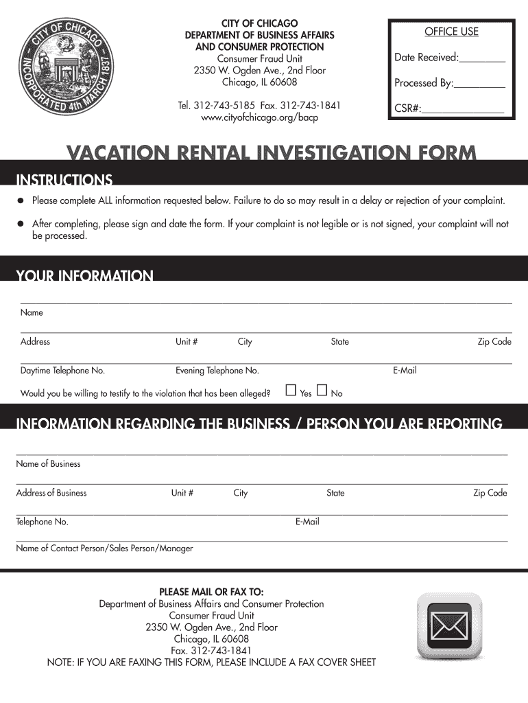 CITY OF CHICAGO DEPARTMENT OF BUSINESS AFFAIRS AND CONSUMER PROTECTION Consumer Fraud Unit 2350 W. Ogden Ave., 2nd Floor Chicago, IL 60608 Date Received: Tel. 3127435185 Fax. 3127431841 www.cityofchicago.org/bacp