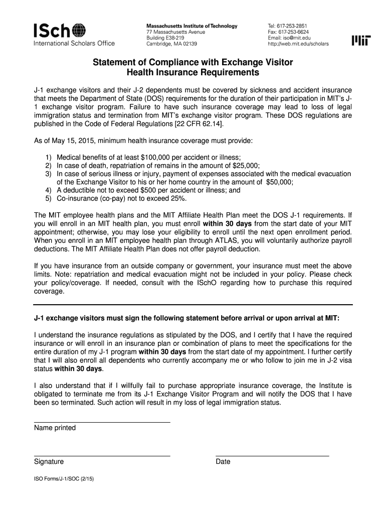 Statement of Compliance with Exchange Visitor Health Insurance Requirements J1 exchange visitors and their J2 dependents must be covered by sickness and accident insurance that meets the Department