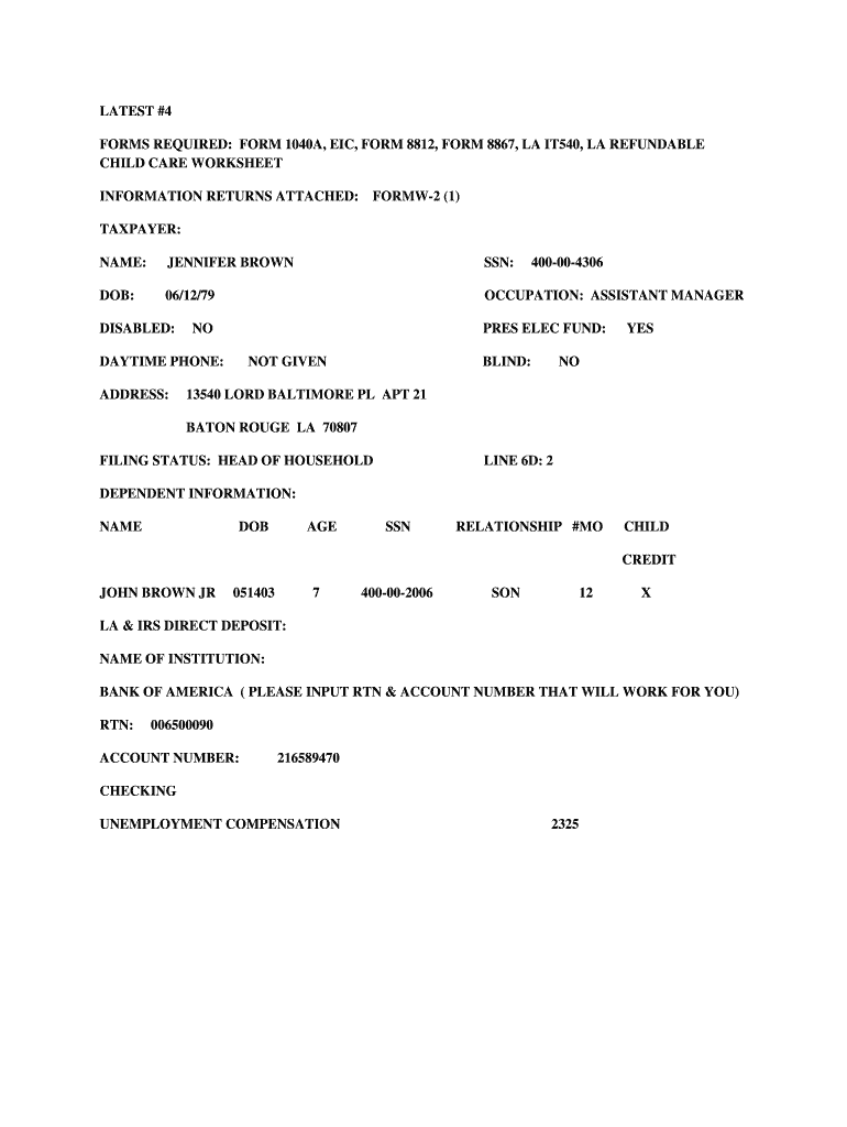 LATEST #4 FORMS REQUIRED: FORM 1040A, EIC, FORM 8812, FORM 8867, LA IT540, LA REFUNDABLE CHILD CARE WORKSHEET INFORMATION RETURNS ATTACHED: FORMW2 (1) TAXPAYER: NAME: JENNIFER BROWN SSN: DOB: 06/12/79