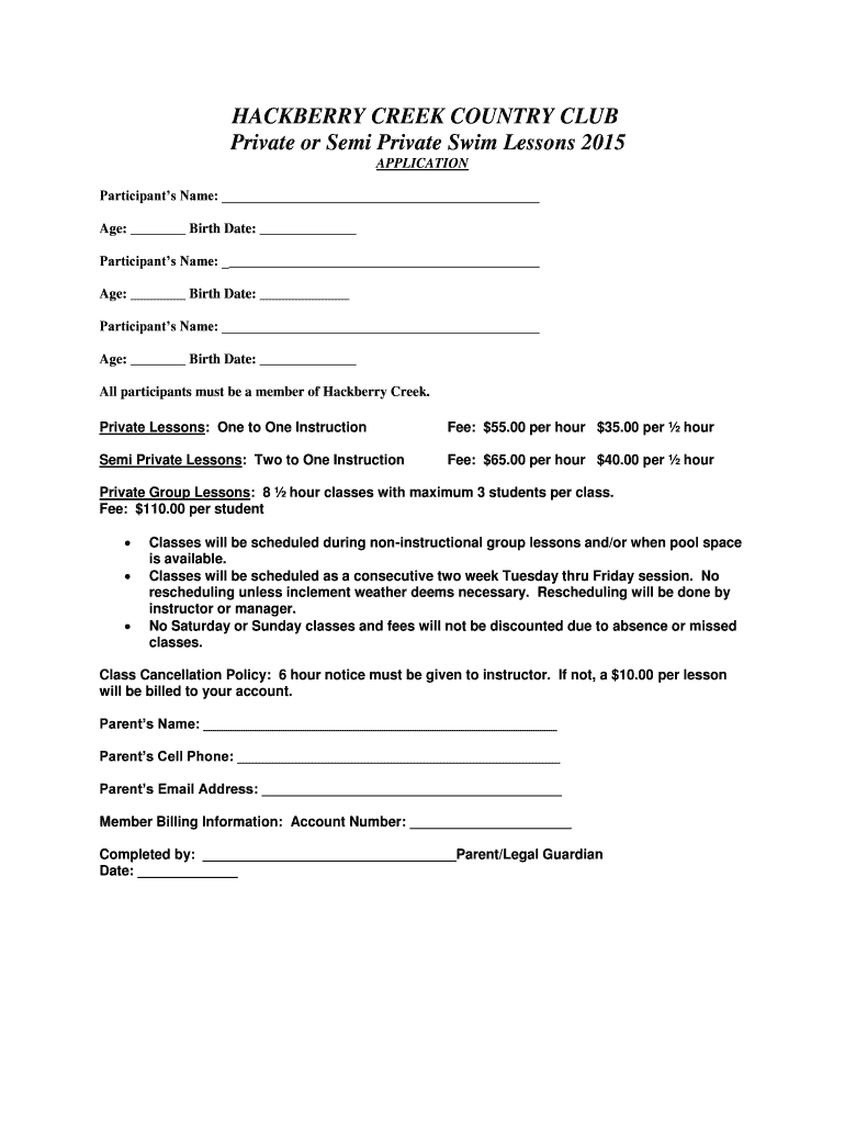 BlackBerry CREEK COUNTRY CLUB Private or Semi Private Swim Lessons 2015 APPLICATION Participants Name: Age: Birth Date: Participants Name: Age: Birth Date: Participants Name: Age: Birth Date: All