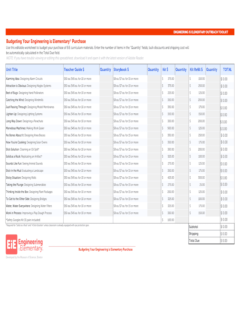 ENGINEERING IS ELEMENTARY OUTREACH TOOLKIT Budgeting Your Engineering is Elementary Purchase Use this editable worksheet to budget your purchase of EIE curriculum materials. Enter the number of items