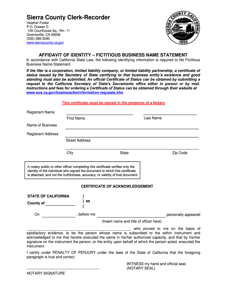 Sierra County ClerkRecorder Heather Foster P.O. Drawer D 100 Courthouse Sq., Rm. 11 Bonneville, CA 95936 (530) 2893295 www.sierracounty.ca.gov AFFIDAVIT OF IDENTITY FICTITIOUS BUSINESS NAME STATEMENT