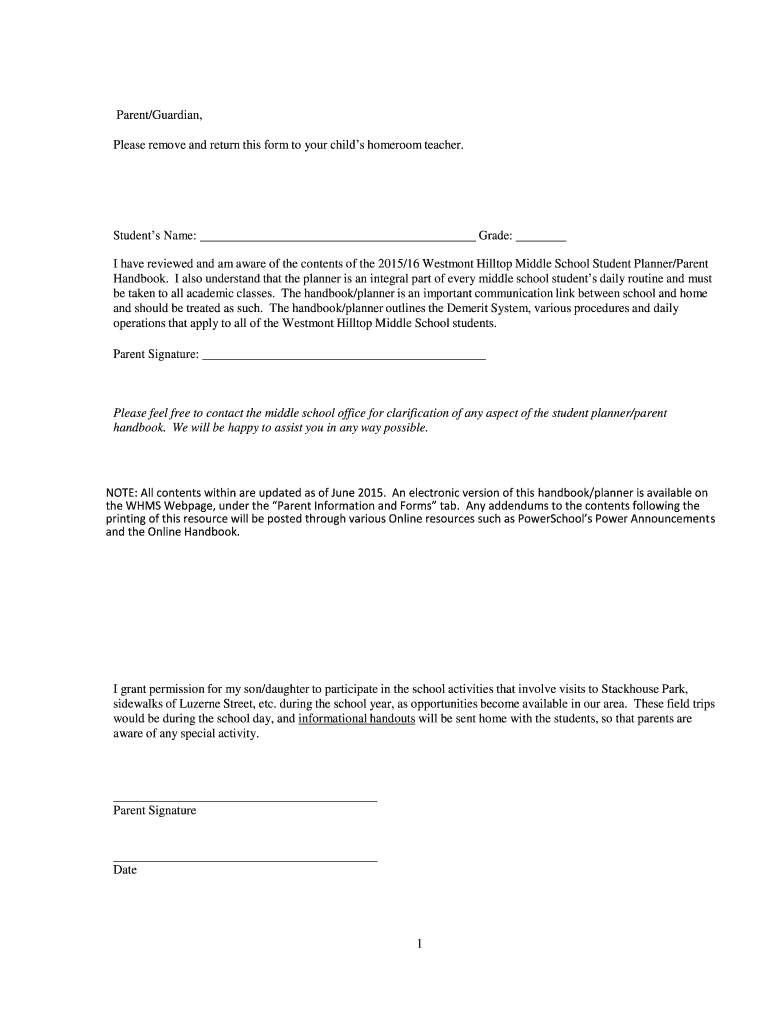 Parent/Guardian, Please remove and return this form to your child s homeroom teacher. Student s Name: Grade: I have reviewed and am aware of the contents of the 2015/16 Westmont Hilltop Middle School