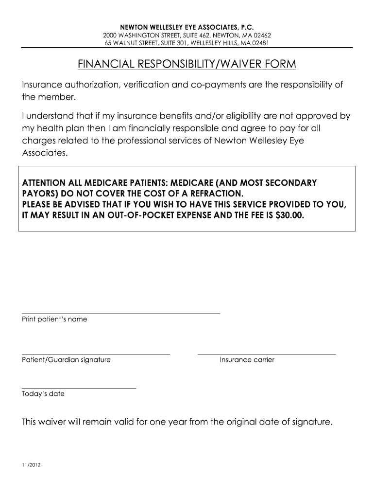 NEWTON WELLESLEY EYE ASSOCIATES, P.C. 2000 WASHINGTON STREET, SUITE 462, NEWTON, MA 02462 65 WALNUT STREET, SUITE 301, WELLESLEY HILLS, MA 02481 FINANCIAL RESPONSIBILITY/WAIVER FORM Insurance authorization,