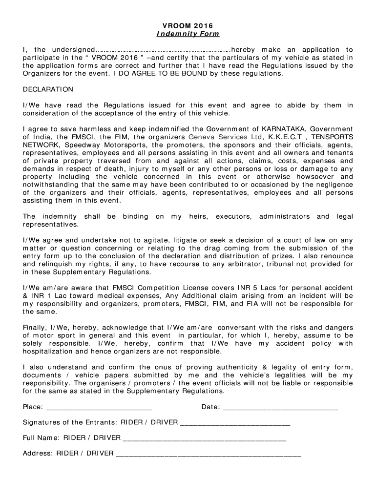 VROOM 2016 Indemnity Form I, the undersigned. Hereby make an application to participate in the VROOM 2016 and certify that the particulars of my vehicle as stated in the application forms are correct