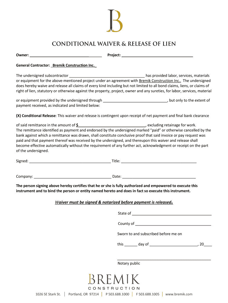 Get the free Conditional bwaiverb amp release of lien - Bremik Construction