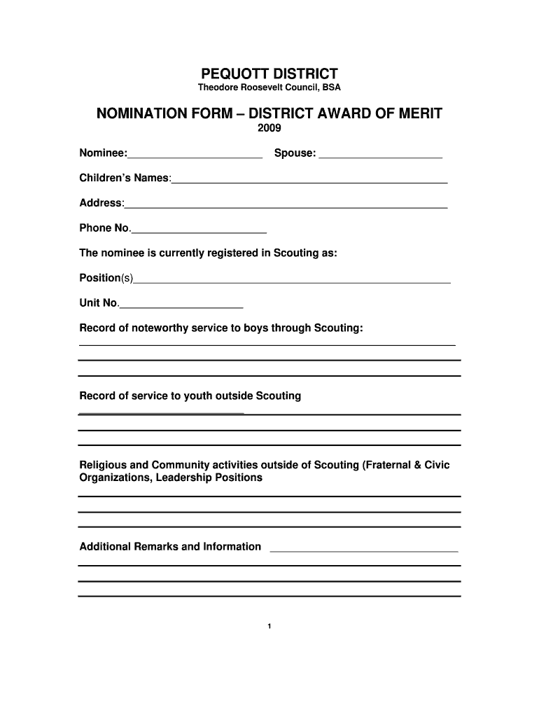 PEQUOT DISTRICT Theodore Roosevelt Council, BSA NOMINATION FORM DISTRICT AWARD OF MERIT 2009 Nominee: Spouse: Children's Names: Address: Phone No. The nominee is currently registered in Scouting as: