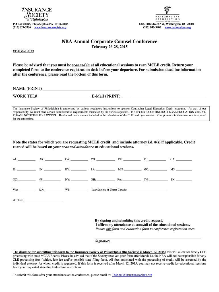 PO Box 40088, Philadelphia, PA 191060088 (215) 6275306 www.insurancesociety.org 1225 11th Street NW, Washington, DC 20001 (202) 8423900 www.nationalbar.org NBA Annual Corporate Counsel Conference